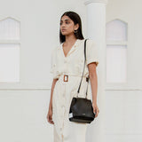 The Chaser Bag is crafted from Black/White Nappa leather.
